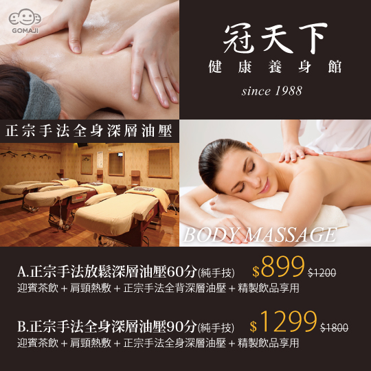 近捷運松江南京站1號出口,【冠天下健康養身館 since 1988】擁有專業技術與幾十年的豐富經驗,正宗手法全身深層油壓,力道十足、手法專業,解放身體的緊繃!