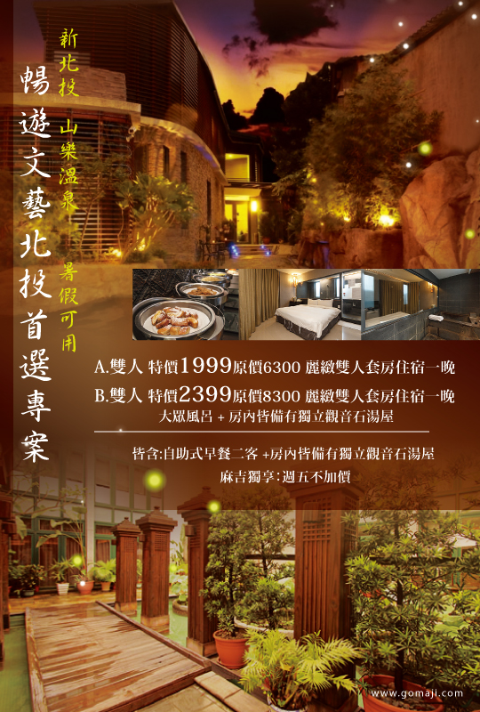 只要1999元起,即可享有【新北投-山樂溫泉會館】暑假可用!暢遊文藝北投首選專案〈含AB.麗緻雙人套房住宿一晚 + 自助式早餐二客 + 房內皆備有獨立觀音石湯屋,B方案另含大眾風呂〉麻吉獨享:週五不加價